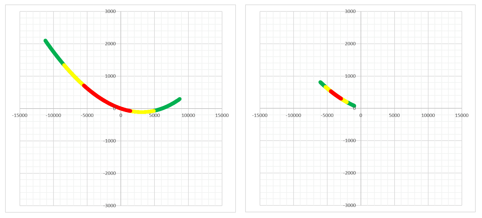 The plots in the figure show the coordinate of the Earth on the plane of the ecliptic (at the origin) and the possible positions of the asteroid, for the time of the predicted impact. Points within the 1-sigma uncertainty region are given in red, the 2-sigma in yellow and the 3-sigma in green. The scale of the axes is expressed in Earth radii. The left plot refers to the old solution, before the remeasurements; the cloud of points clearly passes through the reference system origin (thus impacting the Earth). The right plot corresponds to the new solution after the remeasurements; its smaller uncertainty now shows no impacting solutions within the 3-sigma boundary. Credit: ESA / NEOCC.