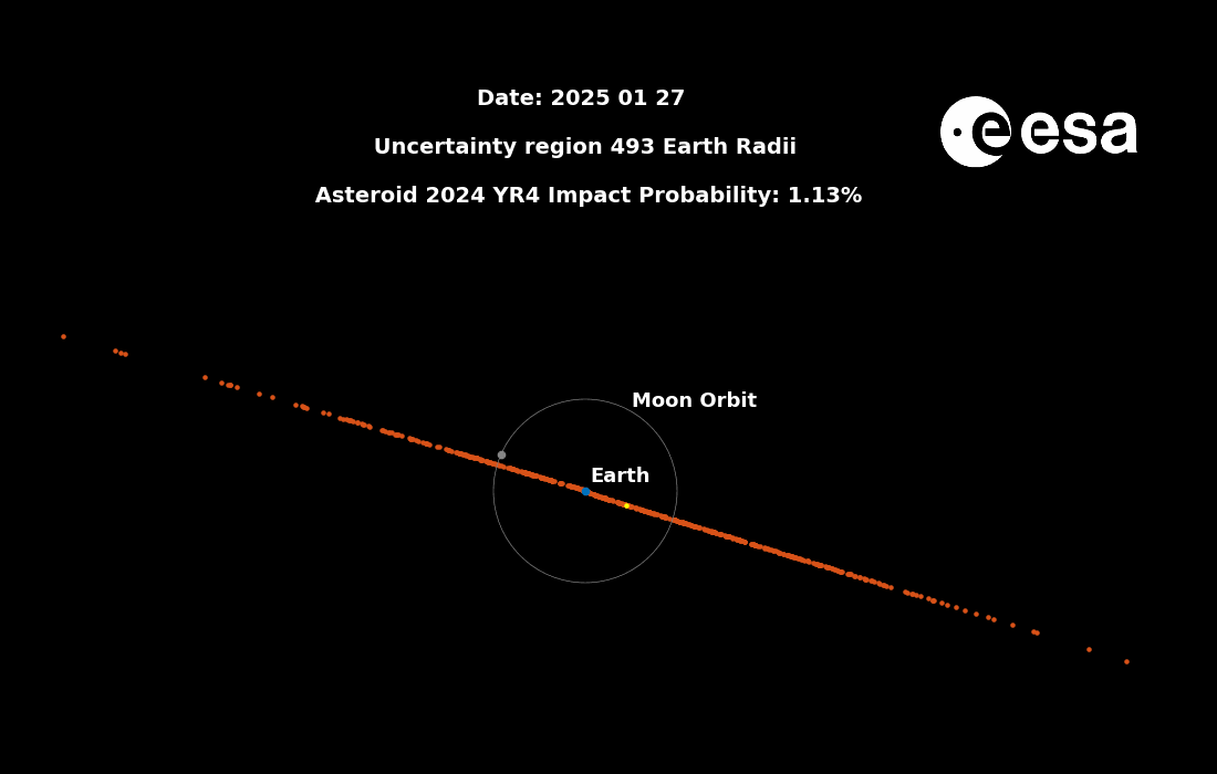 Evolution of the 3-sigma uncertainty region and impact probability of asteroid 2024 YR4 at the possible impact epoch on 22 December 2032, as more observations were becoming available day after day. Credit: ESA / PDO.