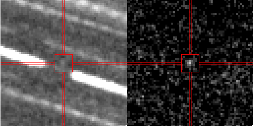 Caption: Plain stack of the images (left), and the same stack processed to enhance the target and remove background sources (right). The object is visible at the centre of the red box. Stacks produced using Tycho. Credits: ESA NEOCC