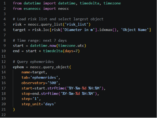 Example Python script querying the NEOCC risk list, selecting the largest object, and retrieving its ephemerides for the next 7 days.