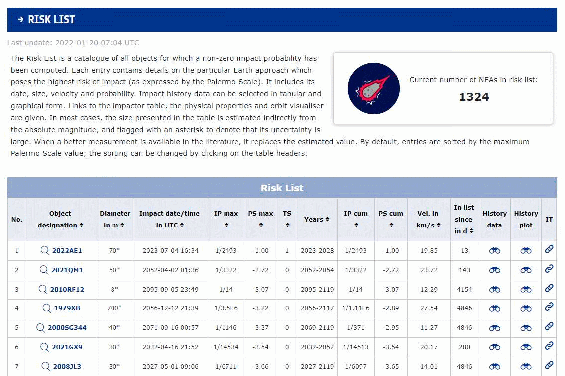 Screenshot of ESA’s risk list on 20 January 2022, last day that 2022 AE1 was in the top position. Credit: ESA / NEOCC.